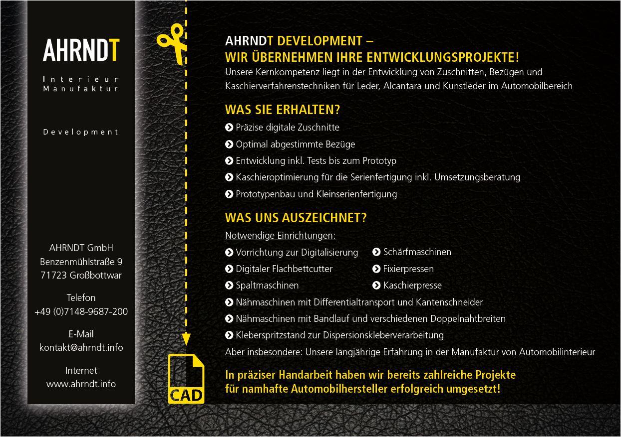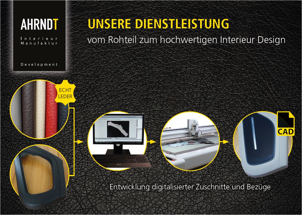 Unsere langjährige Erfahrung und das ausgeprägte Know-How unserer Mitarbeiter bieten wir auch als Dienstleistung in Form von der Entwicklung von Zuschnitten, Bezügen und Kaschierverfahrenstechniken an. Dabei profitieren unsere Kunden von optimal abgestimmten Bezügen, Kaschieroptimierungen für die Serienfertigung inklusive einer Umsetzungsberatung. Auch Fehleranalysen und Prozessoptimierungen konnten wir bereits erfolgreich bei Kunden wie Dräxlmaier und Adient umsetzen.
